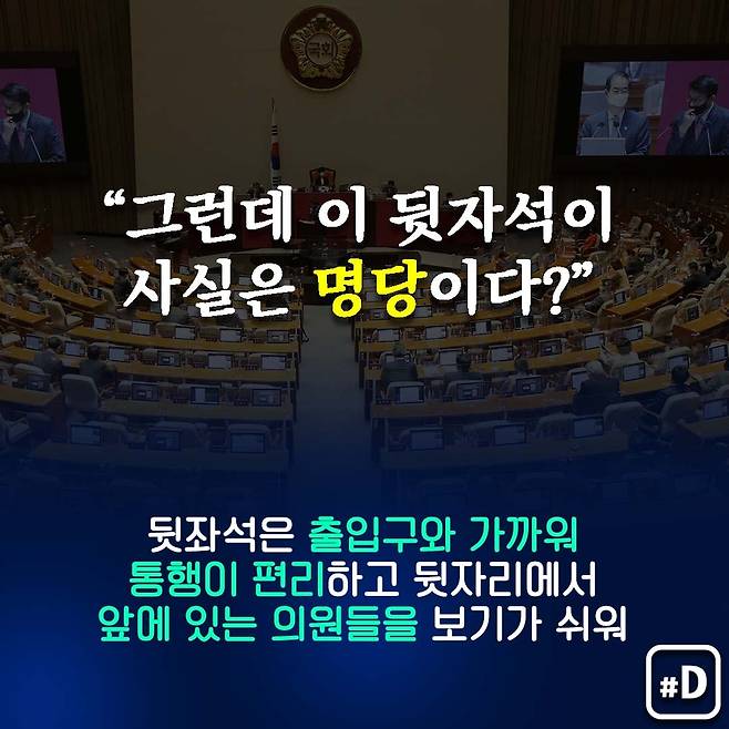 뒷좌석은 출입구와 가까워 통행이 편리하고 뒷자리에서 앞에 있는 의원들을 보기가 쉽죠.