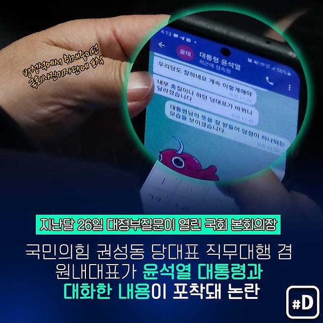 지난달 26일 오후 대정부질문이 열린 국회 본회의장. 국민의힘 권성동 당대표 직무대행 겸 원내대표가 윤석열 대통령과 대화한 내용이 노출돼 논란이 됐습니다.