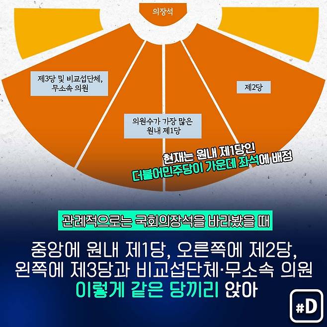 국회의장석을 바라봤을 때 중앙에 원내 제1당이 자리하고 오른쪽에 제2당, 왼쪽에 제3당과 비교섭단체·무소속 의원이 앉는 게 관례입니다.