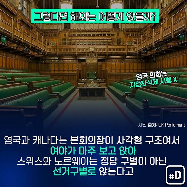 영국과 캐나다는 본회의장이 사각형 구조여서 여야가 마주 보고 앉으며 영국 의회는 지정좌석제를 시행하지 않죠. 스위스와 노르웨이는 정당 구별이 아닌 선거구별로 앉습니다.