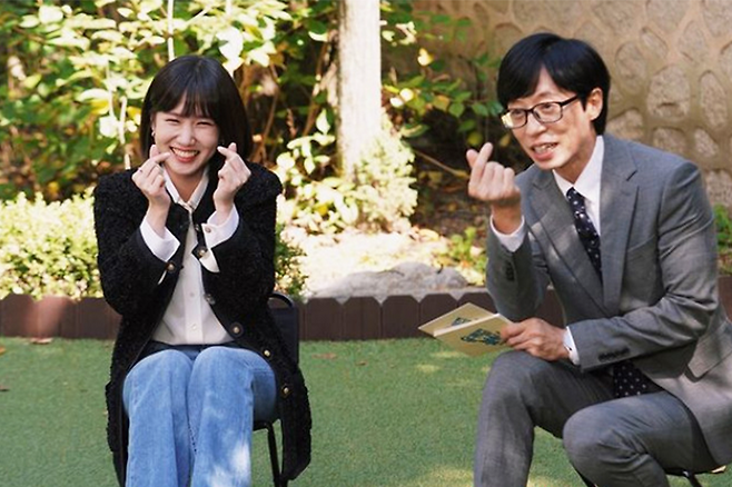 사진 속에는 MC 유재석과 박은빈이 함께 손가락 하트를 만들고 있는 귀여운 모습이 담겼다.