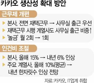 글로벌 경기 침체 우려가 커지는 가운데 국내 대표 플랫폼 업체인 카카오가 임직원의 근무 효율 높이기에 나섰다. 재택근무제를 전격 폐지하고 사무실 출근제를 부활시킨다. 지난해 업계 개발자 수급 경쟁 속에 앞다퉈 높였던 임금 인상률도 실적 둔화 조짐이 커지자 두 자릿수에서 다시 한 자릿수로 줄인다.