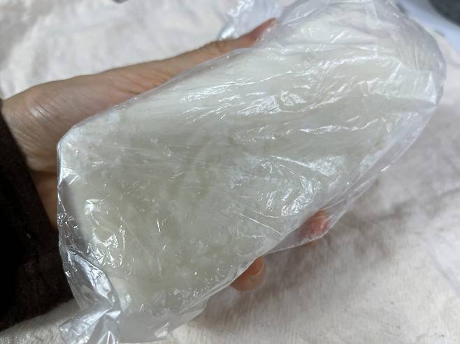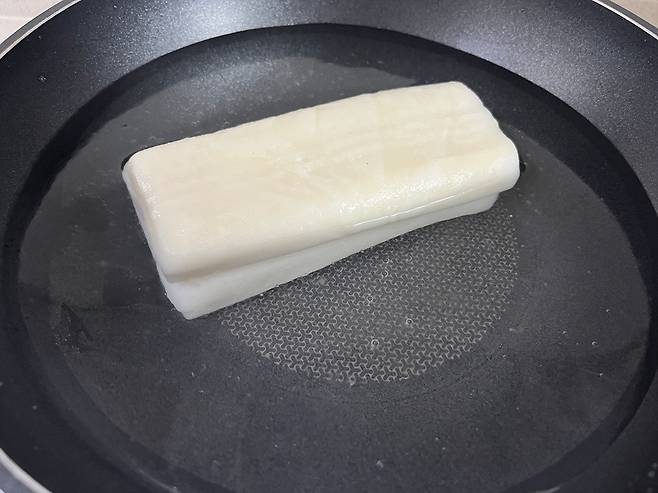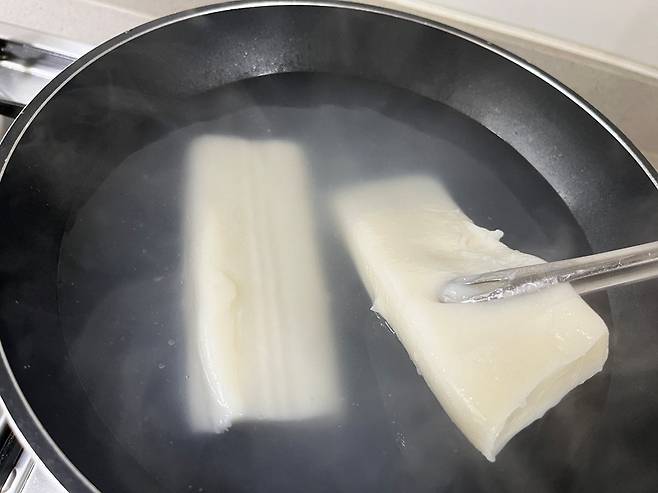 자연해동한 상태의 떡이라 물로 살짝만 데쳤는데도 안쪽까지 부드럽게 익었습니다. 가위로도 쉽게 잘려요.