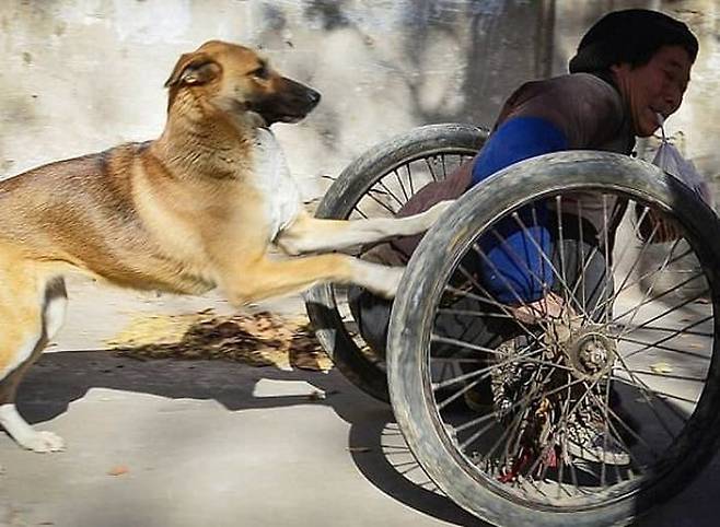 중국 허난성 뤄양시에서 포착된 사진 속에는 강아지가 휠체어를 타고 있는 주인을 위해서 두 앞발로 열심히 밀어주고 있는 모습이 담겨 있었죠.