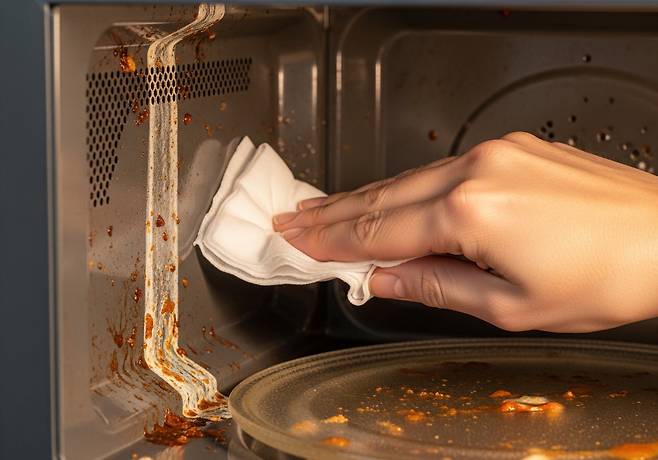 전자레인지 내부는 음식물이 튀어 굳은 얼룩이 많습니다. 물티슈에 식초를 묻혀 닦으면 찌든 때가 훨씬 쉽게 제거됩니다.