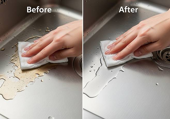 물티슈에 식초를 살짝 묻혀 싱크대를 닦아보면 물때와 기름기가 한 번에 정리됩니다. 식초의 산성 성분이 물때를 풀어주고, 물티슈가 오염을 흡착하는 역할을 합니다.