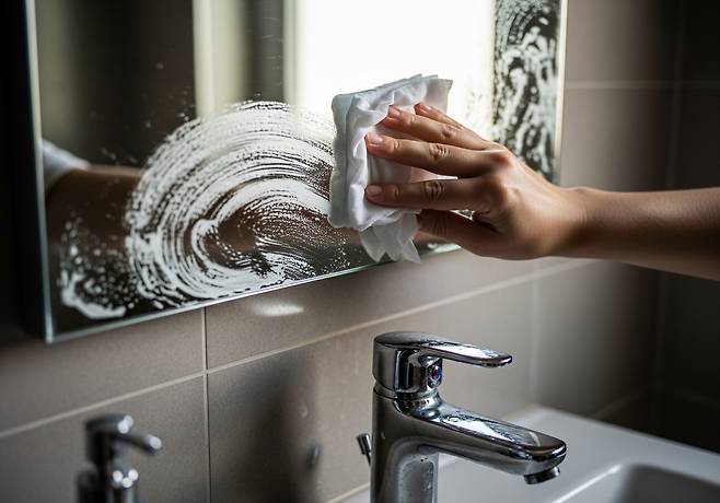 거울에 남은 물자국이나 수도의 하얀 얼룩은 일반 물티슈로는 잘 안 닦입니다. 식초를 살짝 더하면 얼룩이 훨씬 잘 풀립니다.