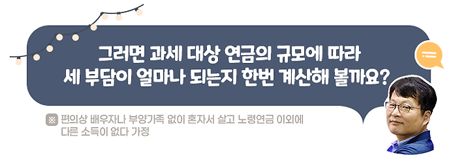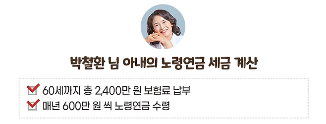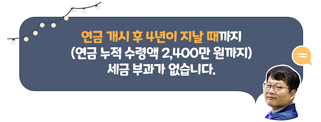 박철환 님의 아내가 2002년 이후 국민연금에 임의가입 하여 60세가 될 때까지 총 2,400만 원을 보험료로 납부했고, 매년 노령연금으로 600만 원씩 수령한다고 가정해 보겠습니다. 물가상승에 따른 연금 인상분이 없다면, 연금 개시 후 4년이 지날 때까지는 과세 대상 연금이 아예 없습니다.