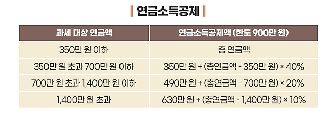과세 대상 연금 소득이 350만 원이 안 되면 전액을 공제하고, 350만 원 초과 700만 원까지는 40%, 700만 원 초과 1,400만 원까지는 20%, 1,400만 원 초과 금액은 10%를 공제해 줍니다. 이런 식으로 최대 900만 원을 공제해 줍니다.
