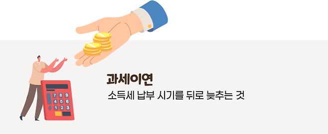 보험료를 내는 동안 과세하지 않고, 연금을 받을 때 과세하겠다는 취지이며, 이렇게 소득세 납부 시기를 뒤로 늦추는 것을 ‘과세이연’이라고 합니다.