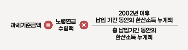 전체 국민연금 보험료 납입 기간의 환산소득을 합쳐 분모에 두고, 2002년 이후 환산소득을 전부 더해 분자에 두면 과세 대상이 되는 연금소득의 비율을 구할 수 있습니다. 여기에 한 해 동안 받은 노령연금을 곱하면 과세기준금액을 산출할 수 있습니다.