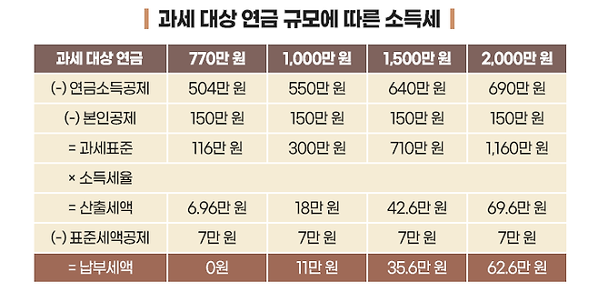 과세 대상 연금소득이 770만 원보다 적은 경우에는 소득세를 한 푼도 내지 않습니다.