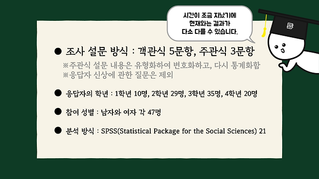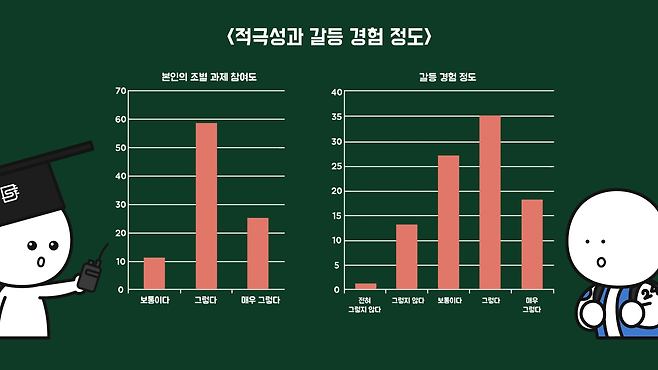 여기까지 조별 과제 중 갈등을 유발하는 빌런을 만났을 때 대학생들이 어떻게 대응하고, 어떤 대응을 효과적으로 생각하는지, 그리고 조별 과제에 대한 인식 양상 등을 살펴봤습니다.