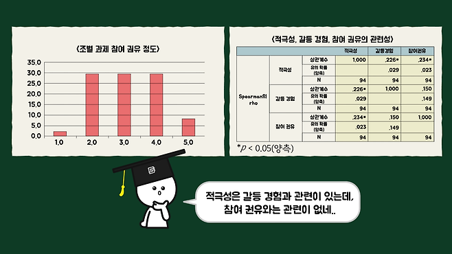 대부분 조별 과제에 적극적으로 참여한다고 응답했고, 갈등 경험 정도도 과반이 넘는 수치가 나왔는데, 이 두 결과 사이의 관계를 통계적으로 살펴봤습니다.
