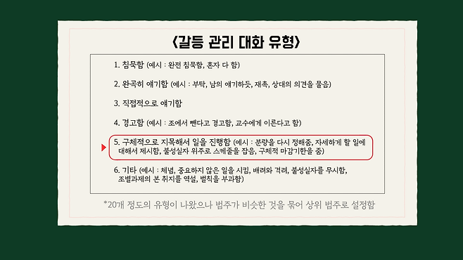그리고 나온 답변을 정리해 갈등 관리 대화 유형을 크게 여섯 가지로 분류했는데, 가장 많은 대답이 나온 유형은 '구체적으로 지목해서 일을 진행한다.'였습니다. 지극히 상식적인 방법으로 공평한 일의 배분과 그 일에 대한 책임감을 느끼게 함으로써 갈등을 해결하려는 유형입니다.