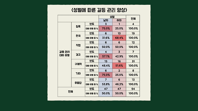 이외에도 대화 유형에 따른 성별 차이도 나타났습니다. 남자의 경우 침묵하거나 경고하거나 기타의 빈도가 비슷하게 나왔는데, 여성의 경우 구체적으로 지목해서 일을 진행한다는 응답 외에는 완곡하게 얘기한다는 대답이 높게 나왔다는 차이점이 있습니다.