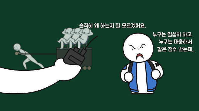 그런데 여기서 생각할 부분은 조별 과제에 대해서 학생들이 어떻게 인식하는지입니다. 조별 과제를 수행하는 구성원의 경우 과제를 공평하게 수행해서 좋은 성과를 얻는 것을 목표로 하고 있으나 조별 과제의 진짜 목적은 앞서 살펴본 것처럼 과정에서 배우는 여러 긍정적인 교육 효과들입니다.