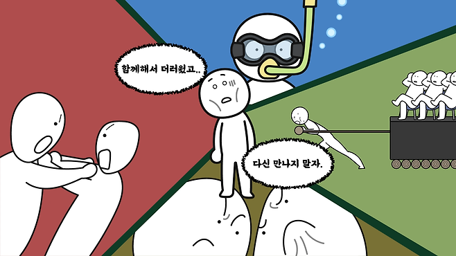 여기까지 조별 과제 중 갈등을 유발하는 빌런을 만났을 때 대학생들이 어떻게 대응하고, 어떤 대응을 효과적으로 생각하는지, 그리고 조별 과제에 대한 인식 양상 등을 살펴봤습니다.