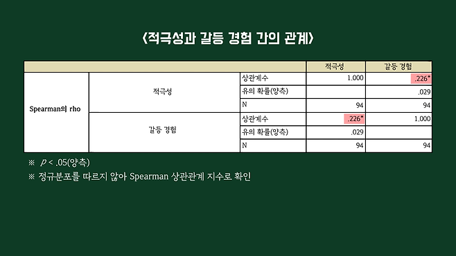 대부분 조별 과제에 적극적으로 참여한다고 응답했고, 갈등 경험 정도도 과반이 넘는 수치가 나왔는데, 이 두 결과 사이의 관계를 통계적으로 살펴봤습니다.