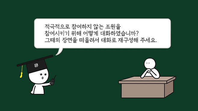 그리고 나온 답변을 정리해 갈등 관리 대화 유형을 크게 여섯 가지로 분류했는데, 가장 많은 대답이 나온 유형은 '구체적으로 지목해서 일을 진행한다.'였습니다. 지극히 상식적인 방법으로 공평한 일의 배분과 그 일에 대한 책임감을 느끼게 함으로써 갈등을 해결하려는 유형입니다.
