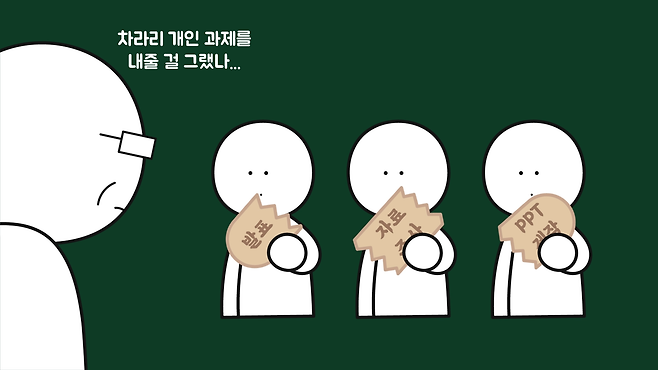 그런데 여기서 생각할 부분은 조별 과제에 대해서 학생들이 어떻게 인식하는지입니다. 조별 과제를 수행하는 구성원의 경우 과제를 공평하게 수행해서 좋은 성과를 얻는 것을 목표로 하고 있으나 조별 과제의 진짜 목적은 앞서 살펴본 것처럼 과정에서 배우는 여러 긍정적인 교육 효과들입니다.