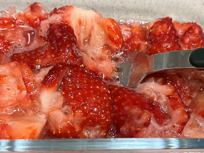 그다음 딸기는 포크나 주걱으로 마구 으깨세요. 모양을 살릴 필요 없이 과즙이 충분히 나오도록 으깨는 것이 중요합니다. 이렇게 하면 딸기 세포벽이 먼저 풀어지면서, 전자레인지로 가열할 때 향과 단맛 성분이 훨씬 빠르게 퍼져 나옵니다.