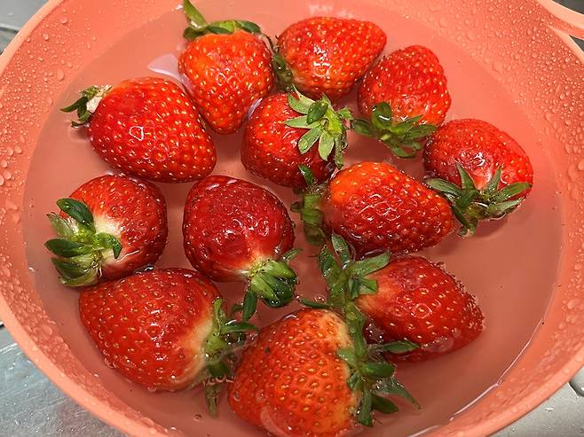 딸기는 먼저 식초를 아주 소량 푼 물에 잠시 담가 표면의 이물질을 제거한 뒤, 흐르는 물에 가볍게 헹궈 주세요. 이렇게 세척하면 눈에 보이지 않는 불순물까지 부드럽게 떨어뜨릴 수 있어, 과육 손상 없이 깔끔하게 세정하는 데 도움이 됩니다.