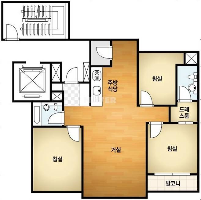 우리집은 햇살이 잘 들어오는 34평의 집이에요. 확장이 모두 되어있고, 3개의 방과 넓은 거실을 가지고 있어요.