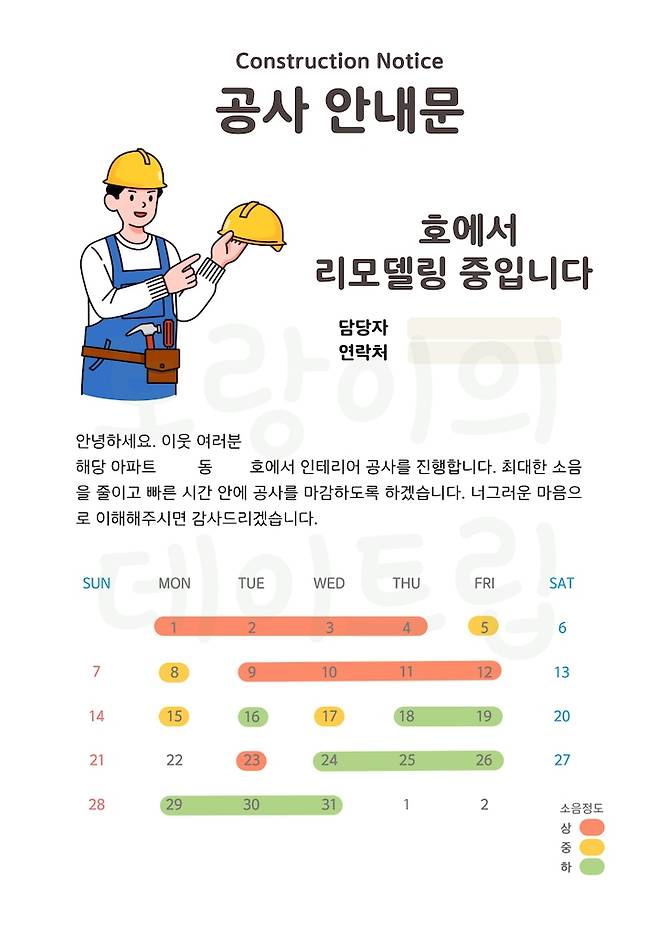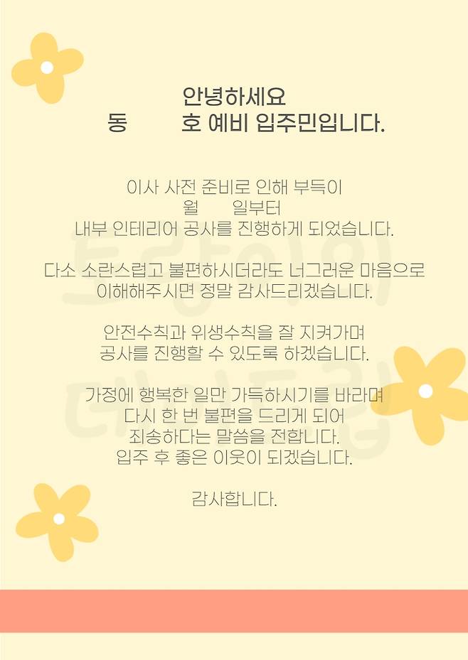 공사가 시작되기 전에, 입주민 공사동의서를 받아야 해요. 아파트 관리사무소에서 양식을 받아서 각 세대를 돌면서 서명을 받았습니다. 전체 세대에 직접 인사를 돌면서 양해 쪽지와 20L 쓰레기봉투 2장씩 봉투에 담아 드렸답니다. 아이가 있는 집에는 곰돌이 막대 초콜릿을 같이 주기도 했어요.