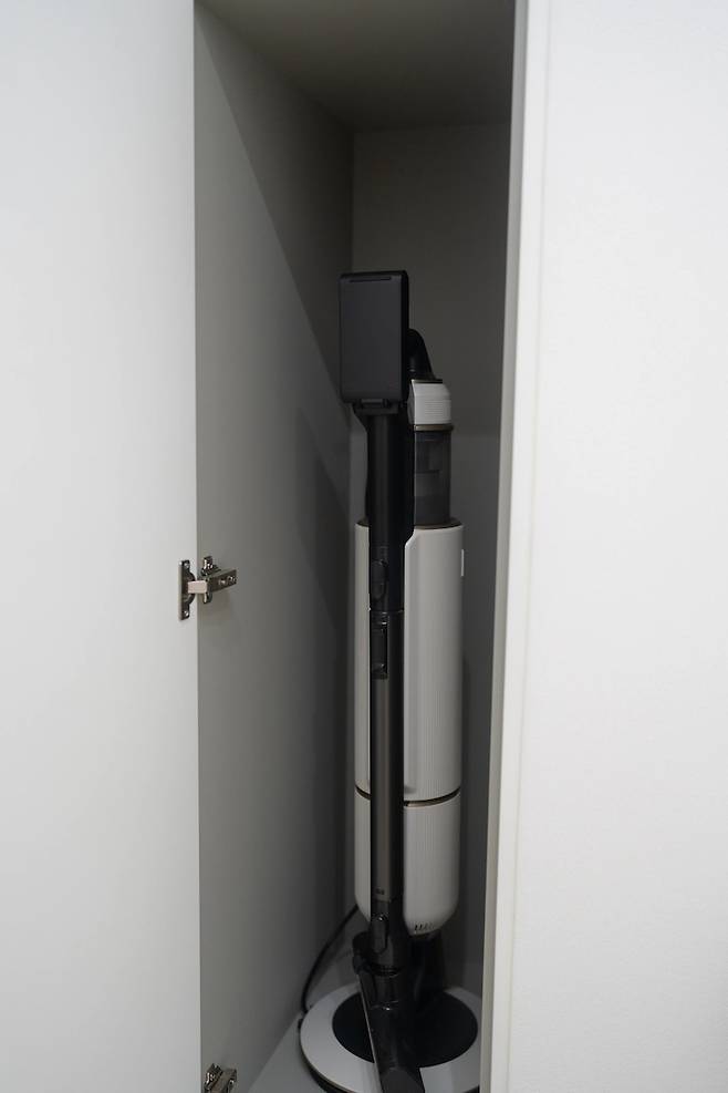 오른쪽의 좁은 키큰장 안에는 제트 청소기를 넣었어요. 제트 청소기는 스테이션에 꽂으면 자동으로 먼지통을 비워주는데요, 이 과정에서 먼지 냄새가 조금 나더라구요. 장에 넣었더니 문을 닫아서 냄새를 차단할 수 있어 좋아요. 청소기를 충전할 수 있도록 뒷편에 콘센트도 신설했어요:)