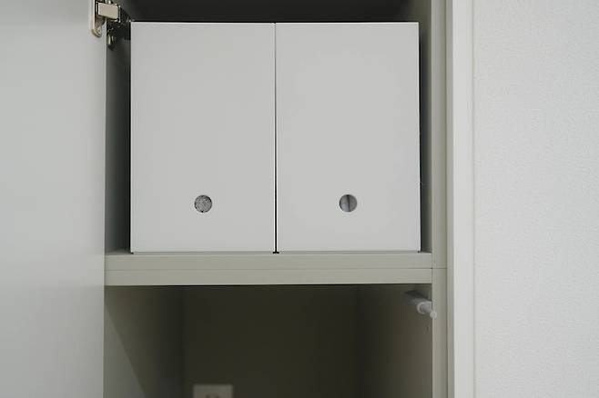 문을 열었을 때 물건이 잡다하게 보이는 것도 원치 않아서 조금 높은 파일함을 사용했어요. 색감도 튼튼함도 훌륭한 무인양품 제품이에요. 이후로 전 무인양품에서 수납함을 잔뜩 샀다는.. 50만 원은 쓴 것 같아요😅