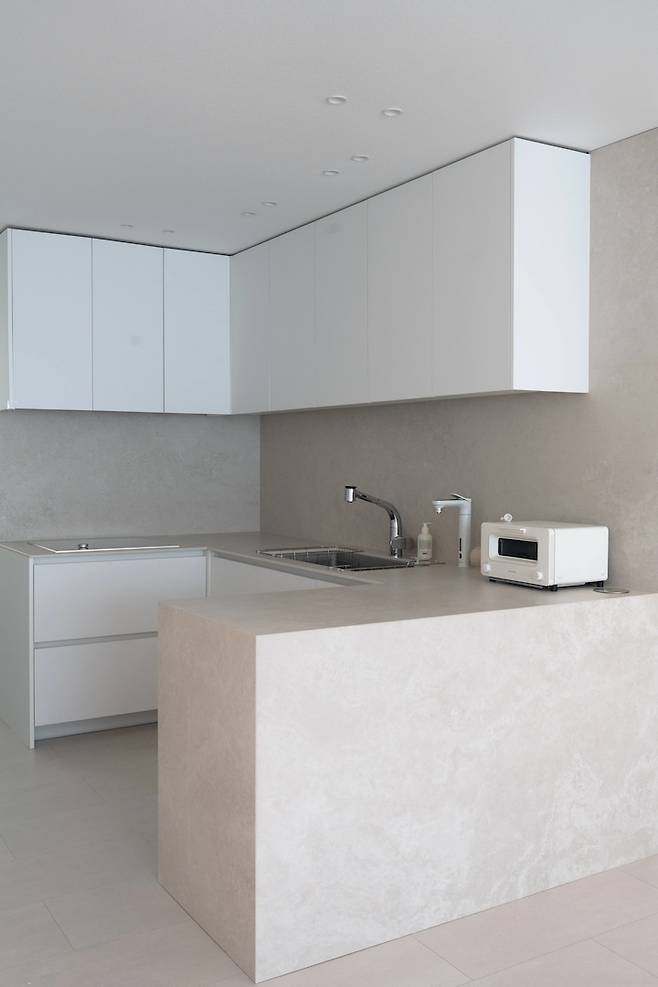 싱크대 상판은 인조 대리석, 엔지니어드 스톤(칸스톤), 세라믹이 있는데, 저는 세라믹을 선택했어요. 또 세라믹을 상판뿐만 아니라 아일랜드 식탁의 옆면, 주방 벽체까지 사용해서 통일감을 줬답니다.