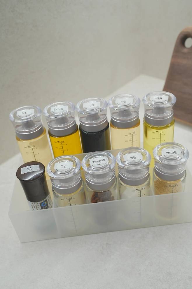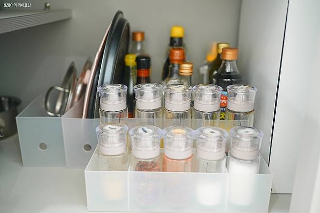 조미료는 따로 담아서 보관하고 있어요. 무인양품에서 구입한 손잡이 달린 보관함이 유리병 사이즈랑 딱 맞아서 너무 잘 쓰고 있답니다:) 처음에 세팅할 땐 이렇게 깔끔깔끔했는데..