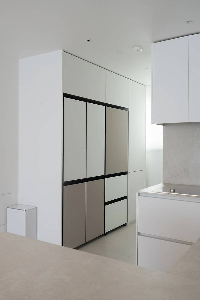 싱크대 반대편으로는 냉장고장과 오븐장이 있어요. 키친핏 냉장고를 빌트인으로 넣었고, 오른편에는 광파오븐과 밥솥을 넣었어요. 조리를 할 때는 문을 열고 레일을 꺼내서 사용해요.