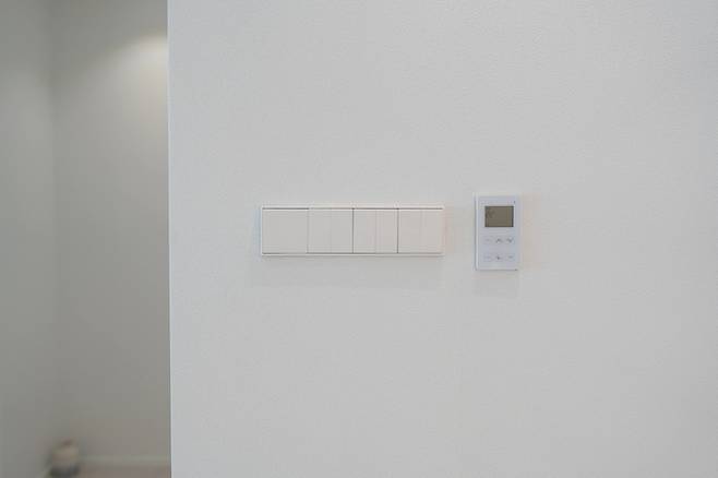 주방 벽에는 융스위치와 온도조절기가 설치되어있어요. 원래는 거실따로 주방따로 스위치가 있었는데, 여기에 7개의 스위치로 다 모았어요.