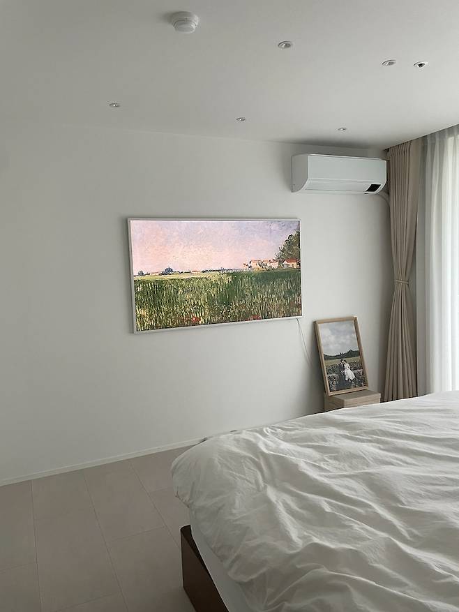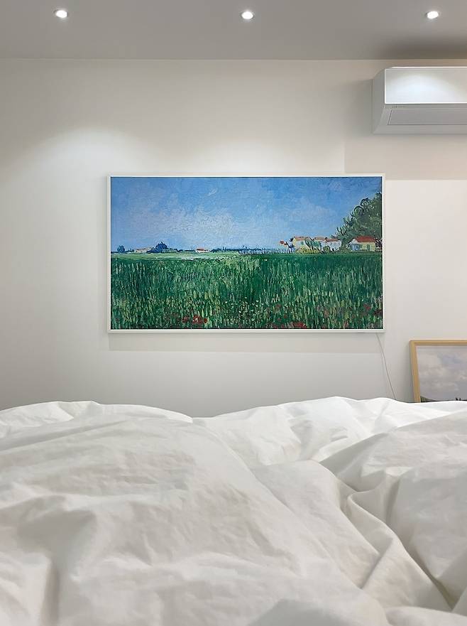 침대 반대편에는 삼성 더프레임 65인치 TV를 설치했어요. 평소에는 이렇게 예쁜 그림을 띄워둘 수 있어서 좋아요. 계절에 맞게 어울리는 명화로 바꾼답니다.