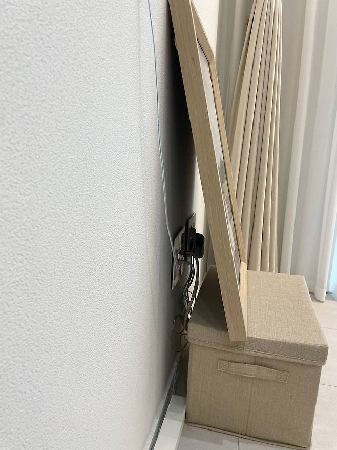 리빙 박스에 있는 구멍으로 선을 넣고 뚜껑을 닫은 후 결혼사진으로 나머지 선을 감추었답니다!