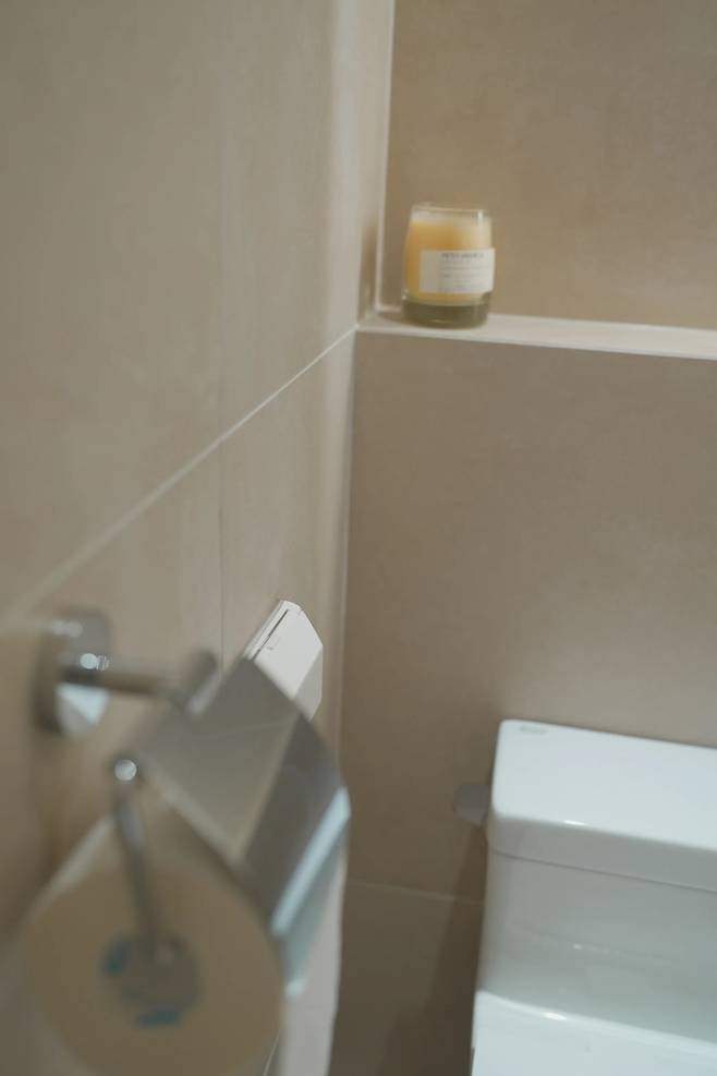 천장에 히든센서를 넣어서, 스위치 없이 들어가면 자동으로 불이 켜진답니다. 외출하고 들어와서 스위치를 누르고 화장실을 들어가면 스위치와 주변 벽지가 더러워지는데, 히든센서를 사용하니 깨끗하게 유지되더라구요.