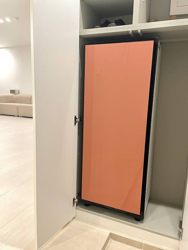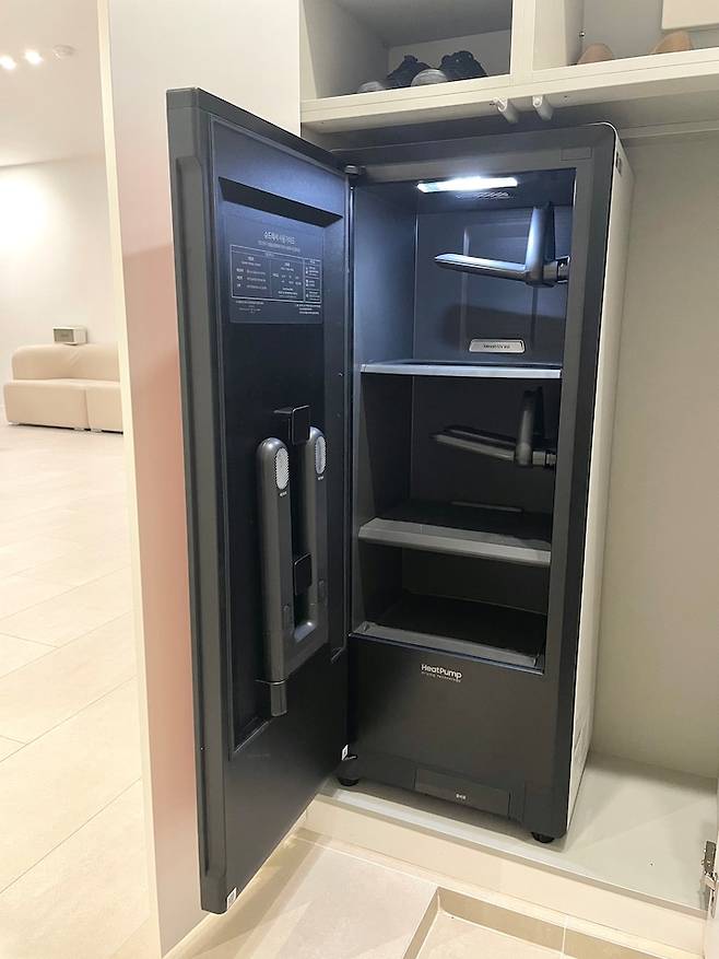 왼쪽 신발장을 열면, 슈드레서가 들어있답니다:) 요즘 같은 장마철에도 신발을 뽀송뽀송하게 관리할 수 있어요. 발냄새도 한 번에 없앨 수 있어서 아주 요물이에요~