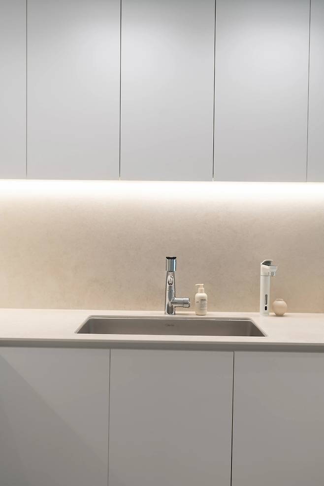 싱크볼은 백조 깜뽀르테 860 제품을 사용했어요. 소문대로 정말 만족해요! 물이 닿는 소리도 조용하고 물얼룩이나 스크래치도 전혀 안 생겨요. 수전은 아메리칸 스탠다드로 필터가 내장된 제품으로 골랐어요. 옆에는 삼성 정수기도 같이 설치했습니다.