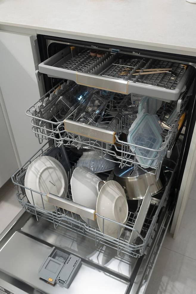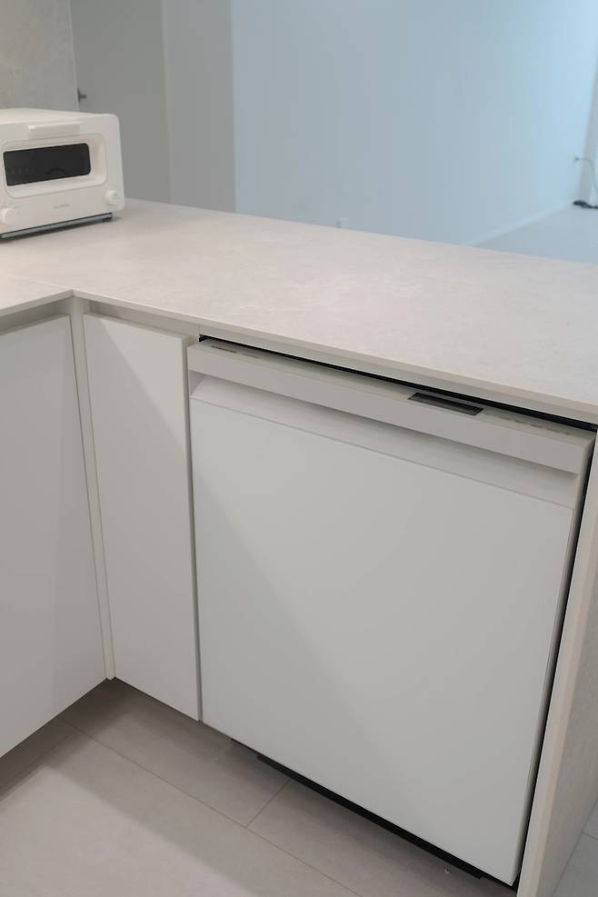 오른쪽에는 아일랜드 식탁 아래에 삼성 식기세척기를 빌트인으로 넣었어요. 14인치로 구매했는데, 정말 넉넉하게 다 들어가서 편해요! 지인들을 집에 초대해서 홈파티하는 걸 좋아하는데, 식세기가 있어서 아주 든든해요.