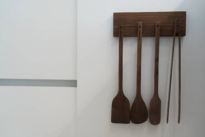 주방 벽이나 싱크대 위에 조리도구를 올리지 않는 대신에 하부장 도어 안쪽에다가 조리도구를 달아두었어요. 제가 좋아하는 도마 브랜드 바우하우스인데, 여기서 이렇게 예쁜 조리도구 세트를 팔더라구요! 코팅팬을 지키기 위해서 볶을 땐 나무 조리도구를 사용하고 있어요.