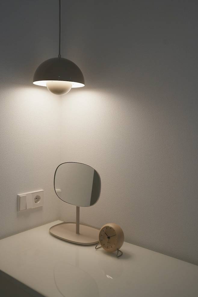 화장대에서 드라이기를 꽂을 수 있도록 화장대 높이를 고려해서 콘센트와 스위치를 만들었어요. 평소 눈여겨 봤던 앤드트레이션 플라워팟 조명을 구입해서 달았고, 예쁜 거울과 시계도 올려두었답니다.