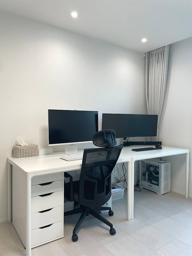 컴퓨터 책상은 두 개를 사서 붙였는데, 공간이 넓어서 쾌적하게 쓰고 있고, 이 책상 아래에 딱 들어가는 이케아 서랍을 찾아서 잡동사니들을 보관하고 있답니다.