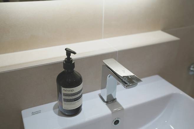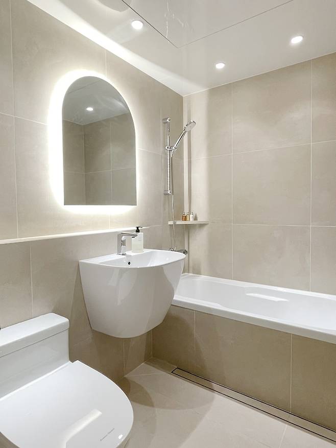 새롭게 변신한 공용 욕실이에요:) 손님용 화장실로 사용할 계획이라, 수납공간이 필요하지 않아서 거울장 대신에 거울 조명을 설치했어요.