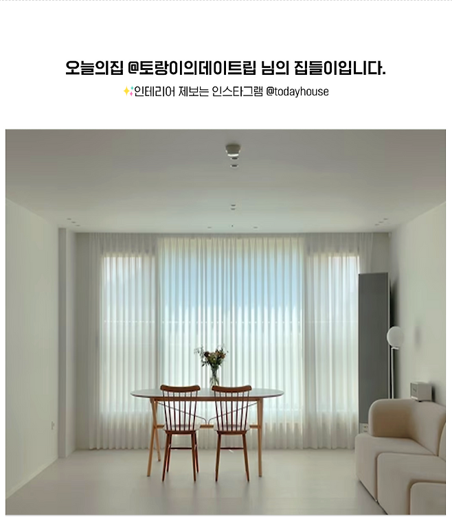 안녕하세요. 토랑이의 데이트립입니다. 지난겨울 5주간의 반셀프 인테리어를 마치고, 알콩달콩 예쁘게 신혼 생활을 하고 있는 🐰토랑부부🐯입니다. 결혼 준비와 반셀프 인테리어 관련 콘텐츠로 유튜브 채널을 운영하고 있어요. 자취할 때부터 <오늘의집>의 오랜 팬이었는데, 이렇게 포스팅을 올리게 되어 기뻐요!