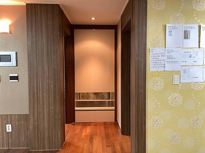 슈드레서를 넣을 수 있도록 고려해서 신발장을 제작했고, 신발장 옆 가벽을 통해서 콘센트로 새로 신설했어요. 신발장에 못 넣었다면 현관에 늘 세워두어야 했을 텐데, 안에 숨겨둘 수 있어서 좋아요.