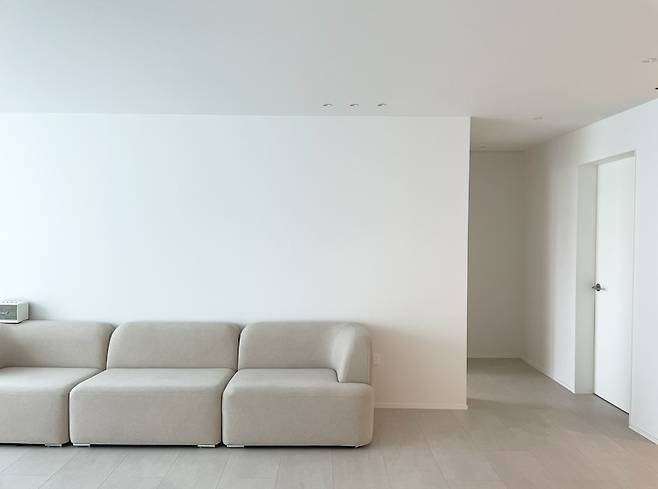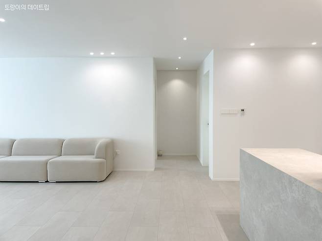 새롭게 바꾼 거실의 모습이에요. 마루는 사하라 라이트로, 벽지는 디아망 모던 회벽 화이트로 시공했어요. 천장지와 벽지를 통일하고 무몰딩 도배를 하니 스튜디오 같은 분위기가 나더라구요.