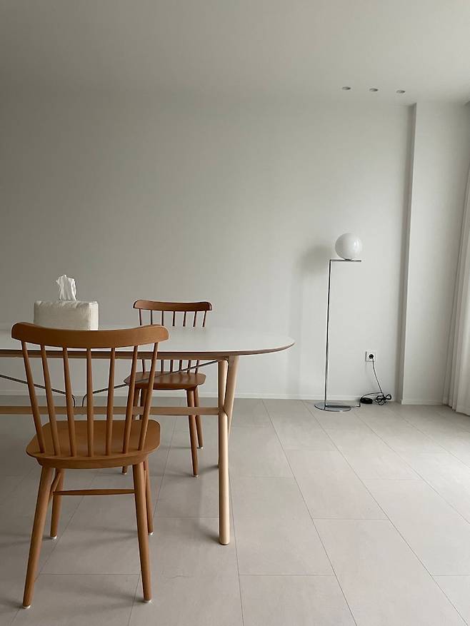 또, 아기가 생기면 식탁의 위치나 쓰임이 바뀔 수도 있을 것 같아 일단 그냥 쓰던 걸 가져왔는데, 생각보다 너무 잘 어울리더라구요? 많이 무겁지 않아서 위치도 자유롭게 옮길 수 있어요. 같이 둔 TON 체어가 이쁨에 한 몫을 하는 것 같아요.