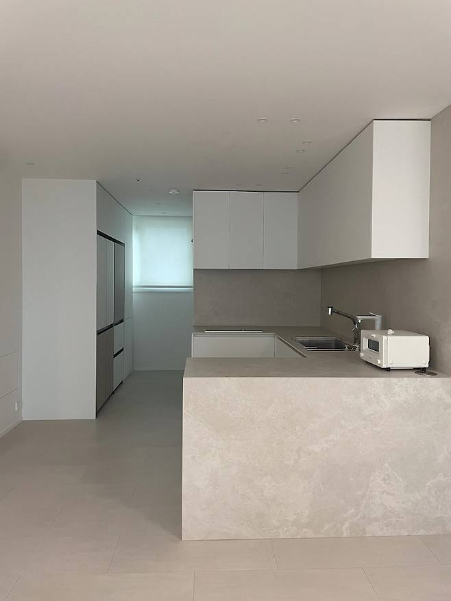 한쪽 벽을 따라 길게 냉장고장과 수납장을 짤까 고민도 했지만, 그럼 공간이 너무 좁아질 것 같아서 줄이기로 했어요. 그리고 싱크대에 붙어있는 불필요한 장과 구조물들은 모두 철거했답니다.